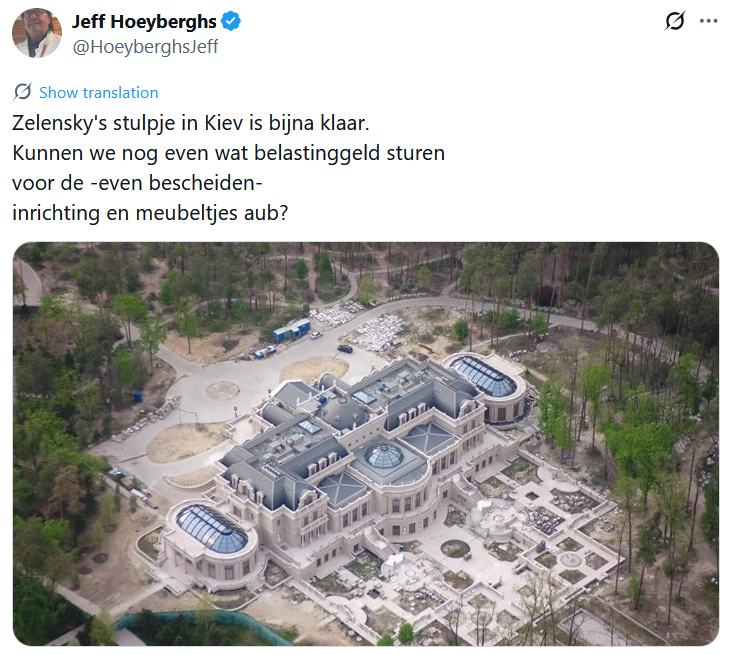 Op X gaat een foto rond van een groot landhuis dat in de buurt van Kiev, de Oekraïense hoofdstad, zou liggen. Er wordt beweerd dat het landhuis van de Oekraïense president Volodymyr Zelensky zou zijn en bijna afgebouwd is. Hij zou het hebben laten bouwen met steungeld dat Westerse landen aan Oekraïne betalen voor de oorlog tegen Rusland.