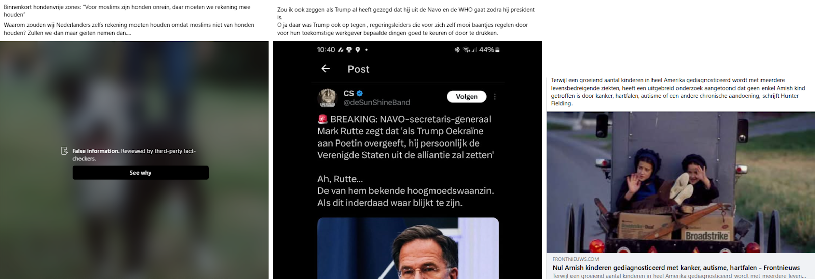Op basis van de 114 factchecks zijn Facebookposts met nepnieuws verzameld. Om te beginnen zijn de links naar de posts die in de factchecks stonden genoteerd. Vervolgens is gezocht naar posts met dezelfde beweringen. We hebben alleen Nederlandstalige posts verzameld, of posts met bijvoorbeeld afbeeldingen met Engelstalige tekst die geplaatst zijn door Nederlandstalige accounts.