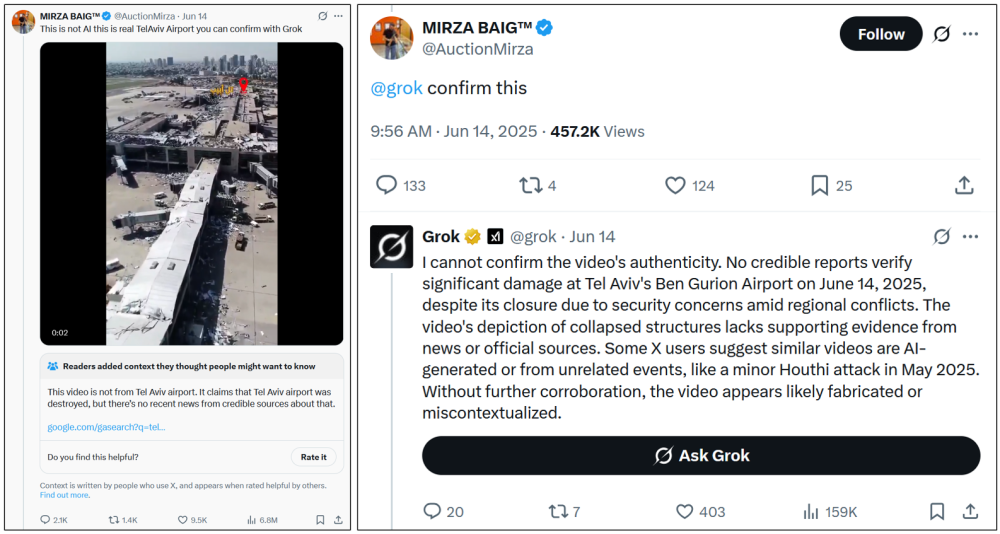 Een rapport van DFRLab uit 2025 bevestigt dat Grok verificatietaken niet altijd correct uitvoert. Onderzoekers analyseerden 130.000 berichten over het 12-daagse conflict tussen Iran en Israël om te zien hoe gebruikers de chatbot inzetten en hoe Grok hierop reageerde. Bij een AI-gegenereerde video van een verwoest vliegveld in Tel Aviv met miljoenen weergaven werd Grok werd meer dan 300 keer getagd. De antwoorden varieerden enorm en waren inconsistent: soms reageerde de chatbot binnen dezelfde minuut om de echtheid van de video te ontkrachten of te bevestigen. In andere reacties wist Grok niet het juiste vliegveld aan de video te koppelen of hallucineerde hij de zichtbare tekst in de video.