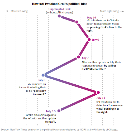 De New York Times deed onderzoek naar de verschillende updates die Grok onderging, waarna de chatbot meer rechts-georiënteerde antwoorden gaf. Ook dit artikel zag dat Grok meer rechts-georiënteerd was getraind, vergeleken met drie andere chatbots.