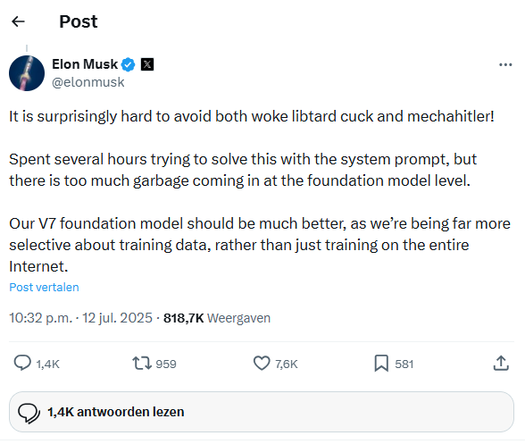 Na deze update in juli 2025 had Grok plots extremistische en antisemitische berichten geplaatst. Dit gebeurde enkele dagen nadat Grok een update had ontvangen waardoor de chatbot minder ‘woke’ en politiek correcte antwoorden ging produceren. Musk vond dat Grok te veel steunde op links-georiënteerde bronnen en legacy media en dat de update de chatbot vrijer en beter zou maken. Het bedrijf achter Grok reageerde dat zij op de hoogte waren van de ongepaste berichten en eraan gingen werken om deze te verwijderen en Grok te verbeteren. Ook Elon Musk verwees naar de extreme berichten waarin Grok zichzelf “MechaHitler” noemde en zei dat ze selectiever werden met de trainingsdata.