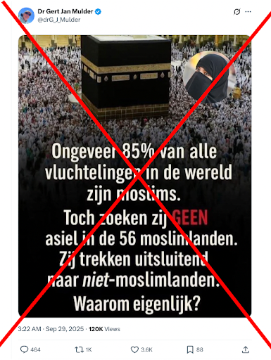 Op 29 september plaatste Gert Jan Mulder een afbeelding op X met een aantal beweringen over vluchtelingen. In de afbeelding valt te lezen dat ongeveer 85% van alle vluchtelingen in de wereld moslims zouden zijn. Ook zouden zij geen asiel zoeken in de 56 moslimlanden en alleen naar niet-moslimlanden trekken. Op 2 oktober is de post van Gert Jan Mulder 120 duizend keer bekeken, duizenden keren geliket en duizend keer gerepost.