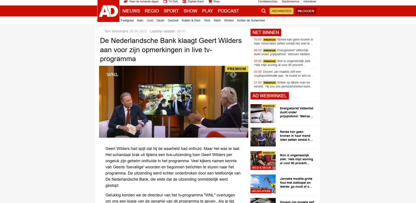 Als we op deze advertenties klikken, komen we uit op een website die als twee druppels water lijkt op die van het Algemeen Dagblad (AD). Alleen het lettertype verschilt. Er is een artikel te lezen waarin De Nederlandsche Bank Geert Wilders aanklaagt over opmerkingen die hij gedaan zou hebben tijdens een interview bij WNL. In het nepinterview vertelt Wilders hoe hij rijk is geworden met cryptohandel via een online platform, volgens hem een manier waarmee iedereen snel rijk kan worden. Het interview wordt dan onderbroken door De Nederlandsche Bank en eindigt met een verslag van een “nieuwsredacteur” die uitlegt hoe het platform werkt en winst genereert.
