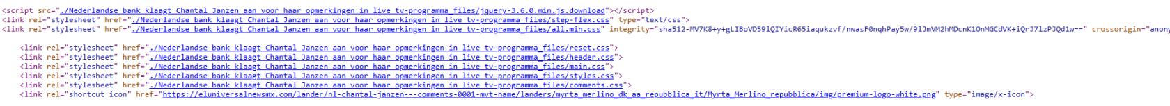 De rest van de neppagina heeft reacties van nepgebruikers die dezelfde oplichterij aanprijzen als Wilders zogenaamd doet in het artikel. In de zijlijn van de neppagina staan titels van echte AD-artikelen, zoals deze en deze. Beide zijn geschreven op 7 februari 2023, waarschijnlijk de datum waarop de neppagina in elkaar is gezet. Kijken we in de broncode van de pagina, dan zien we herhaaldelijk de kop “Nederlandse bank klaagt Chantal Janzen aan voor haar opmerkingen in live tv-programma”, wat erop duidt dat de ‘geïnterviewden’ op dit soort pagina’s steeds veranderen.