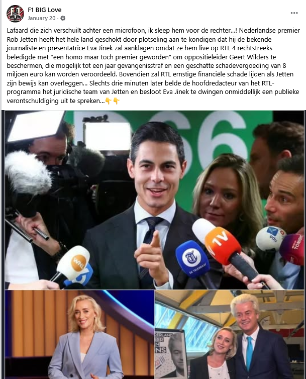Verder wordt in het artikel over Eva Jinek beweerd dat zij werkzaam is voor RTL en Rob Jetten beledigd zou hebben bij RTL 4. Het klopt dat Jinek bij RTL werkte tussen 2020 en 2024, maar ze keerde in dat laatste jaar terug naar de publieke omroep, specifiek bij AVROTROS. Het is dus zeer opmerkelijk dat in 2026 geschreven wordt dat Jinek bij RTL werkt. Ook is RTL 4 geen individueel tv-programma, maar een televisiezender. De talkshow die Eva Jinek bij RTL presenteerde heette Jinek.