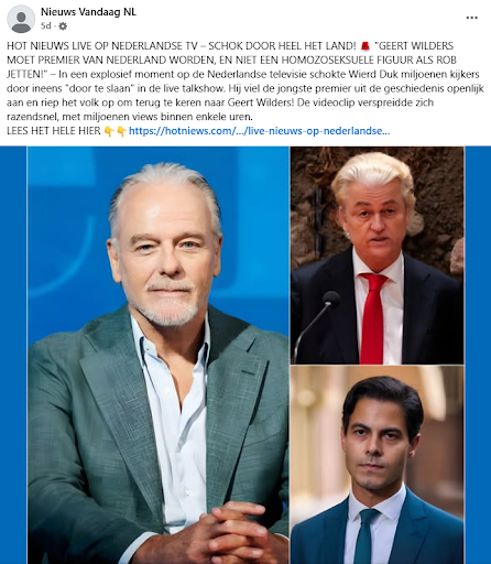 Op Facebook gaan berichten rond over vermeende incidenten in de media die gaan over Rob Jetten en zijn homoseksualiteit. Volgens de berichten, die naar verschillende pulpnieuwssites linken, zou opiniemaker Wierd Duk van De Telegraaf en talkshow Nieuws van de Dag op televisie gezegd hebben dat Geert Wilders (PVV) premier had moeten worden en dat een ‘homoseksuele figuur’ als Rob Jetten niet geschikt zou zijn. Deze berichten hebben op 24 februari duizenden likes en honderden reacties vergaard.