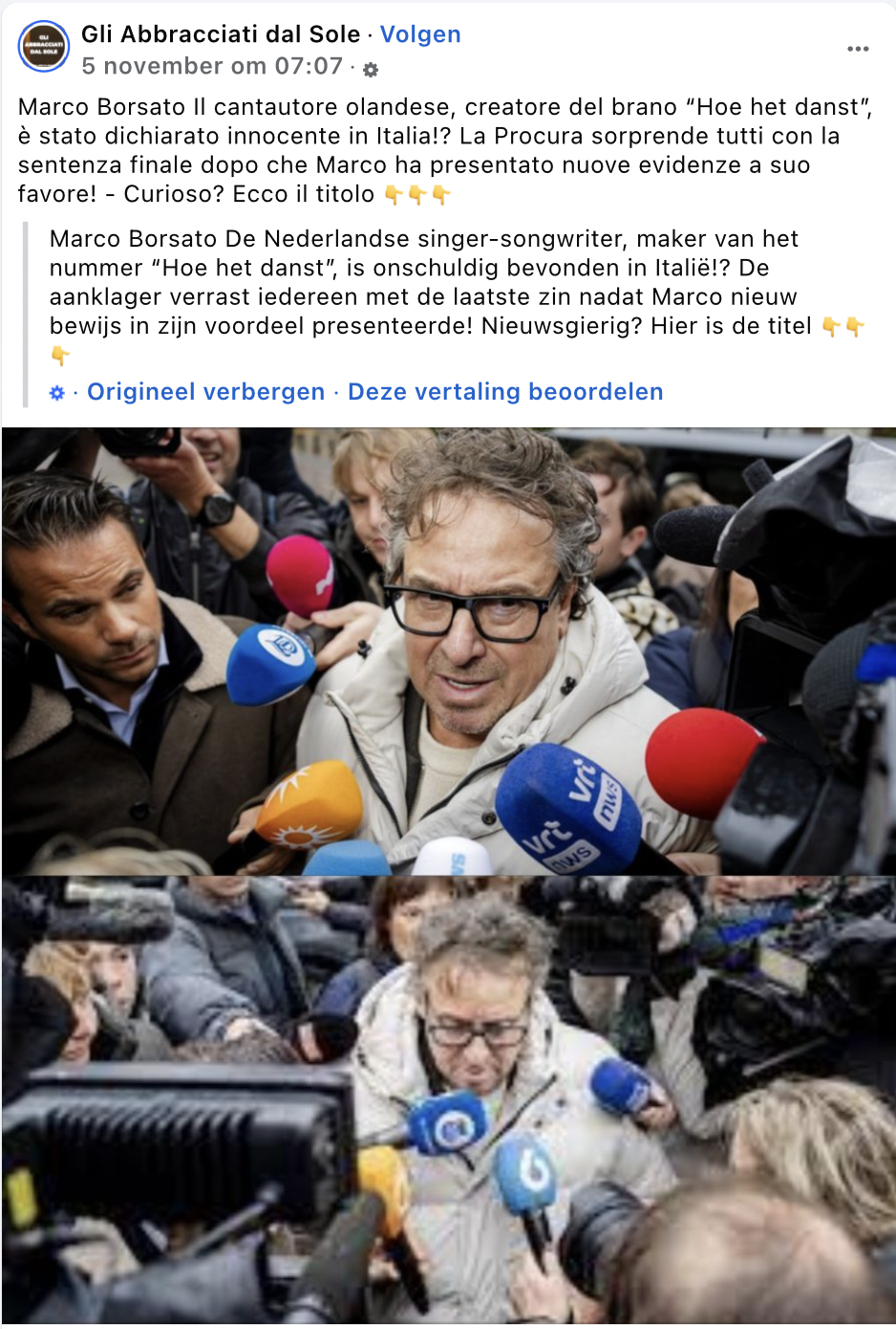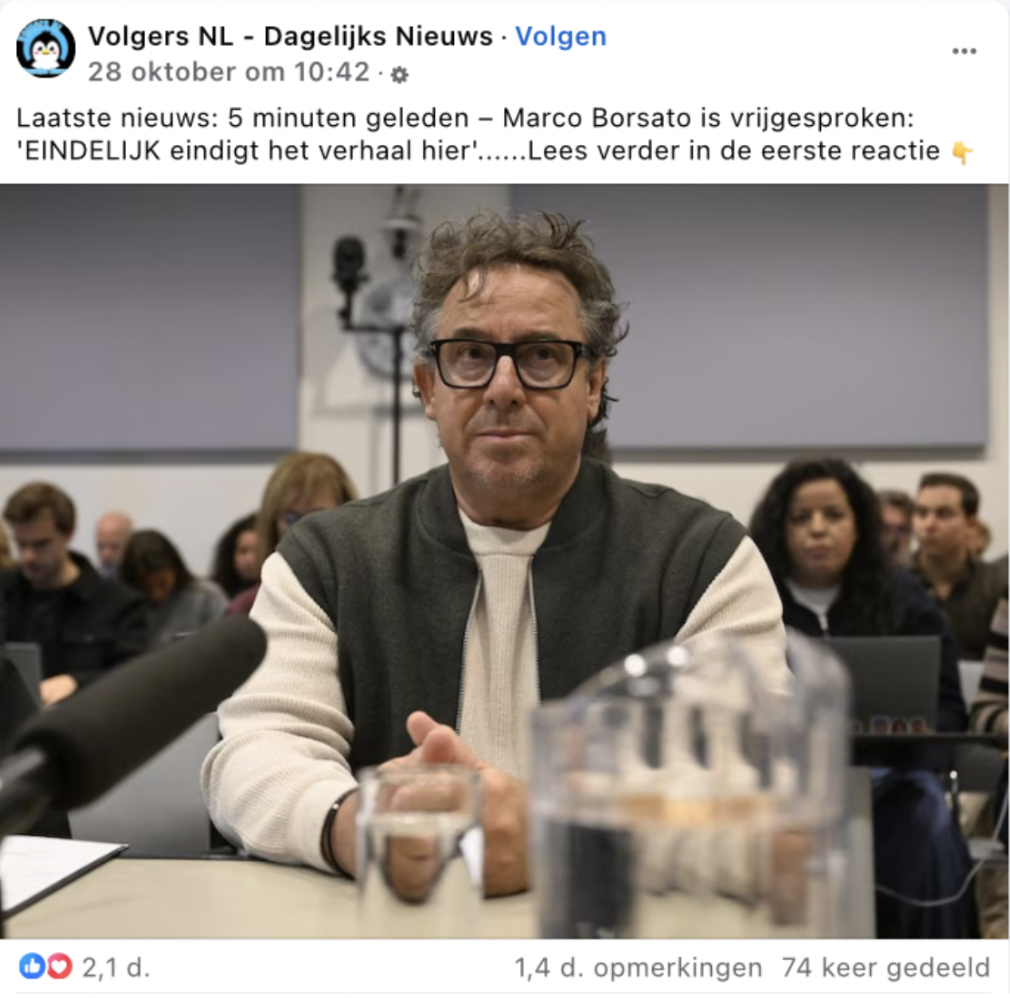 Op 28 oktober begon de rechtszaak tegen Marco Borsato. De zanger wordt verdacht van ontucht met een meisje van vijftien. Diezelfde dag, om twaalf over half elf ‘s ochtends, verscheen op Facebook het bericht: ‘Laatste nieuws: 5 minuten geleden – Marco Borsato is vrijgesproken.’ (gearchiveerd) Het werd tegelijkertijd gepubliceerd door de Facebookpagina’s Volgers NL – Dagelijks Nieuws, Hondenliefde NL en Dutch Daily Dose.