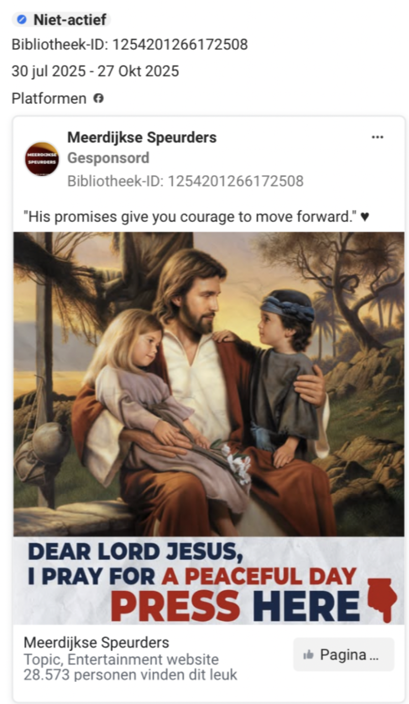 Een deel van de advertenties is in het Engels gesteld en bevat christelijke afbeeldingen en boodschappen, bedoeld om likes te verkrijgen van Facebookgebruikers uit andere landen.