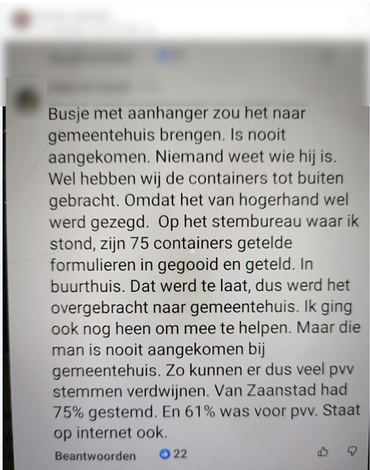 De oudste, ons bekende versie van het bericht over de gestolen containers met stembiljetten dateert uit de nacht van donderdag 30 op vrijdag 31 oktober. We vonden het bericht alleen als screenshot, het origineel is verwijderd of werd gepost in een privé-Facebookgroep van PVV-aanhangers. Het bericht is oorspronkelijk gepost door een account waarvan de naam ook voorkomt in andere versies van het verhaal, als degene die getuige zou zijn geweest van de diefstal. We noemen die naam niet omdat deze Facebookgebruiker geen publieke figuur is en niet uit was op publiciteit.